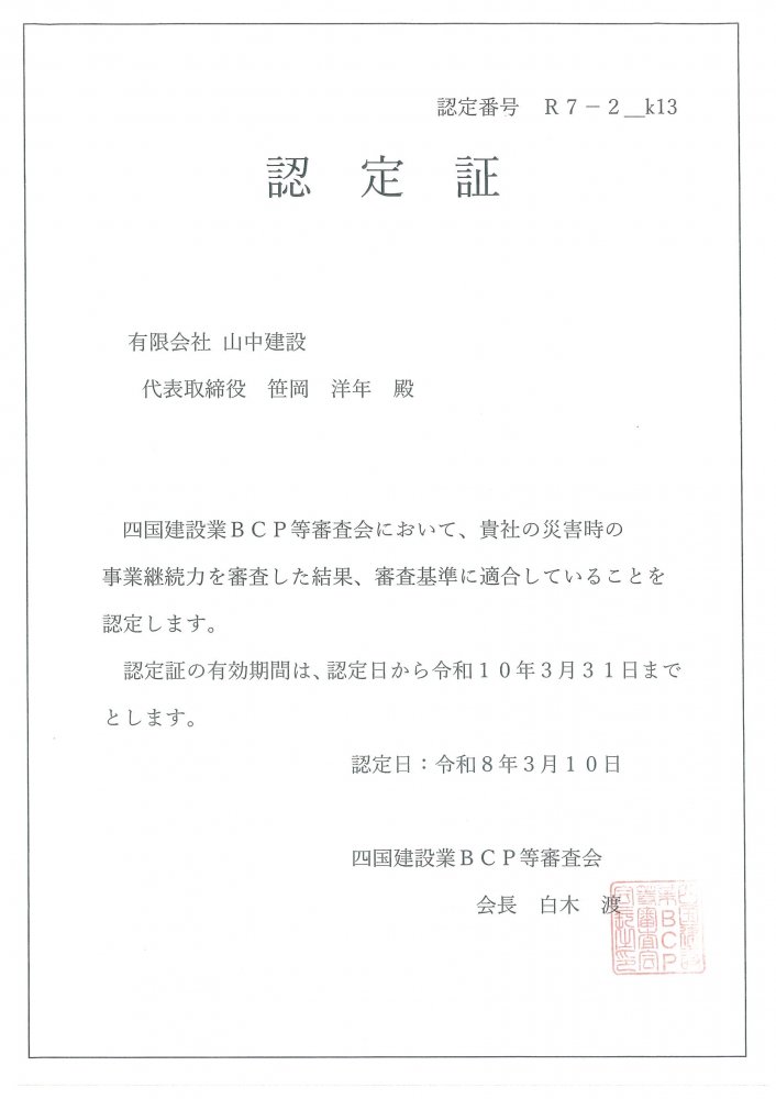 四国建設業BCP認定証